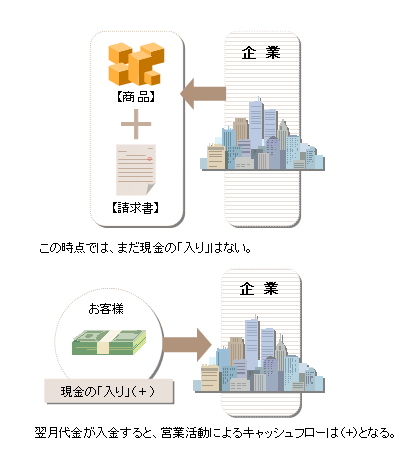 従って、ここでのキャッシュフローはプラス(+)になっていることが大変重要です。企業の本来の活動でキャッシュが足りないと、企業活動を行うことが出来なくなります。支払手形を決済するお金がないと銀行取引が停止され企業活動が出来なくなります(倒産です)。